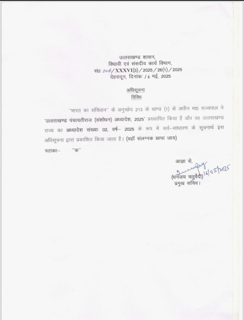 विधायी एवं संसदीय कार्य विभाग की ओर से जारी अधिसूचना के मुताबिक, “भारत का संविधान” के अनुच्छेद 213 के खण्ड (1) के अधीन राज्यपाल ने ‘उत्तराखण्ड पंचायतीराज (संशोधन) अध्यादेश, 2025’ को मंजूरी दे दी है. राज्य सरकार की ओर से अधिसूचना जारी किए जाने के बाद ही पंचायती राज एक्ट संशोधन उत्तराखंड में लागू हो गया है.