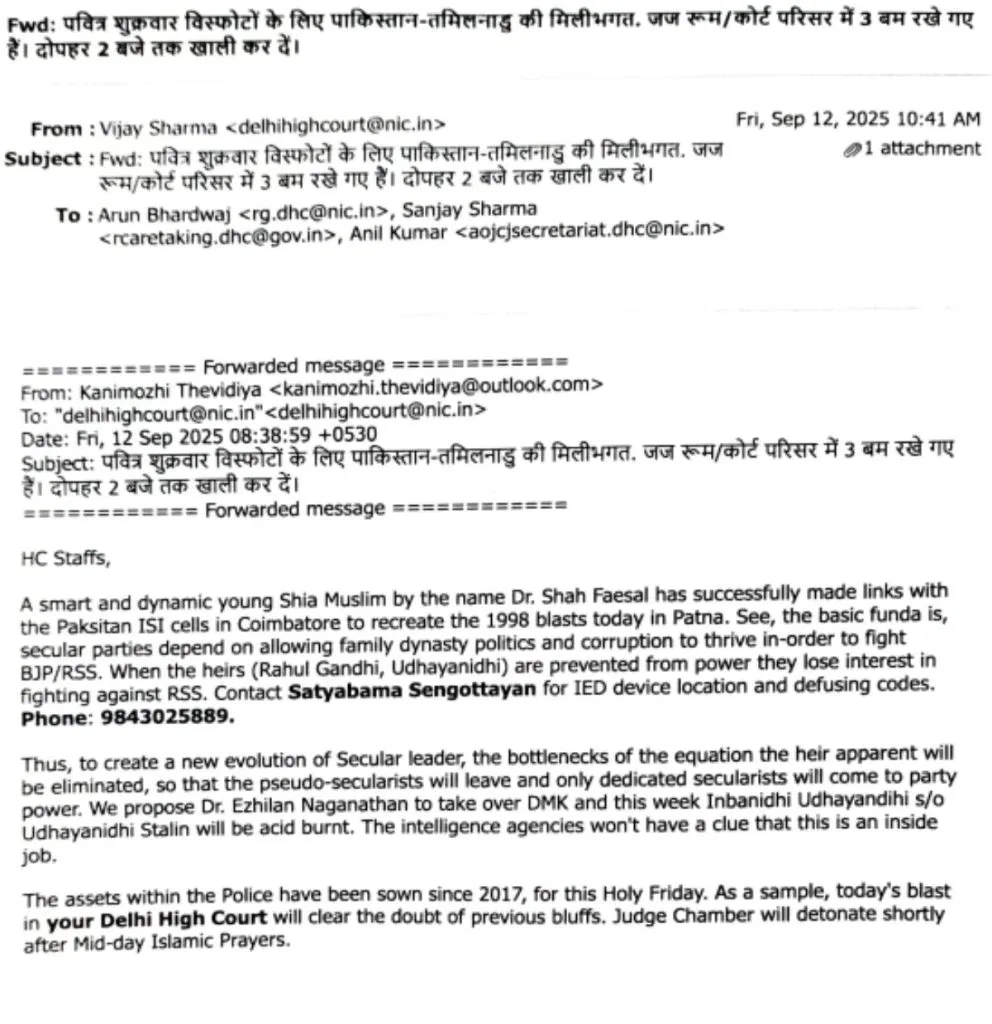 बता दें कि बम की धमकी वाला ईमेल आज सुबह 10 बजकर 41 मिनट पर दिल्ली हाई कोर्ट के महापंजीयक अरुण भारद्वाज को मिला. इसके बाद जज अपनी अदालतों से उठ खड़े हुए. इसके तुरंत बाद, एक बम निरोधक दस्ता भी हाई कोर्ट परिसर में पहुंच गया. पुलिस ने फौरन सुरक्षा-प्रोटोकॉल लागू करते हुए सभी जजों को कक्षों से बाहर निकाला और वकीलों, स्टाफ तथा लोगों को कोर्ट परिसर खाली करने का निर्देश दिया. दिल्ली हाईकोर्ट के बार एसोसिएशन के सचिव विक्रम सिंह पंवार ने आजतक से बातचीत करते हुए कहा कि सुरक्षा तंत्र स्थिति का आंकलन कर रहा हैष ईमेल को गंभीरता से लिया जा रहा है. फिलहाल घबराने की कोई ज़रूरत नहीं है.