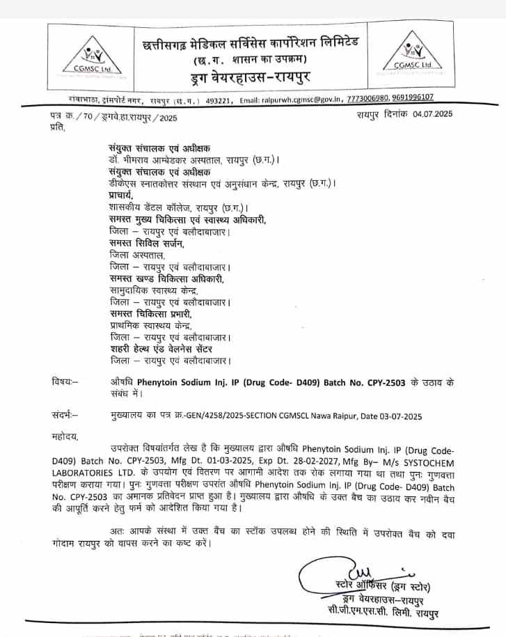 बता दें कि Phenytoin Sodium इंजेक्शन अमानक निकलने पर इसके उपयोग और वितरण पर छत्तीसगढ़ मेडिकल सर्विसेज कॉरपोरेशन लिमिटेड (CGMSC) ने रोक लगाई थी. इस दवा की गुणवता का फिर से परीक्षण किया गया, जिसमें दवा को अमानक पाया गया. सीजीएमएससी ने फर्म को Phenytoin Sodium दवा का उठाव कर नई बैच की दवा आपूर्ति करने आदेशित किया है. साथ ही अस्पताओं को निर्देशित किया गया है कि इस दवा का स्टॉक उपलब्ध है तो इसे वापस गोदाम में जमा कर दें. बता दें कि इस दवाई का उपयोग मिर्गी झटके और सर में चोट होने के बाद होने वाली झटका रोकने के लिए की जाती थी.