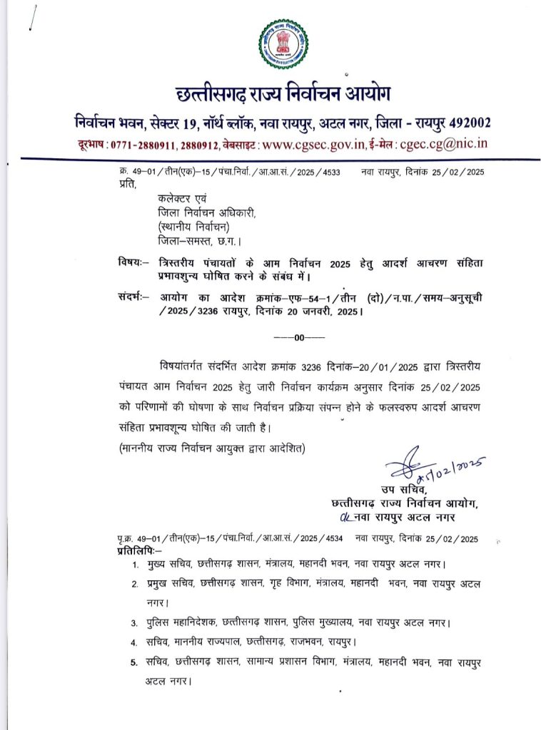सत्या राजपूत, रायपुर। छत्तीसगढ़ में नगरीय निकाय और त्रिस्तरीय पंचायत चुनाव 2025 सफलतापूर्वक संपन्न हो गए हैं. चुनावों के नतीजे आने के बाद राज्य निर्वाचन आयोग ने आचार संहिता समाप्त कर दी है. इस संबंध में राज्य निर्वाचन आयोग ने आदेश भी जारी किया है.