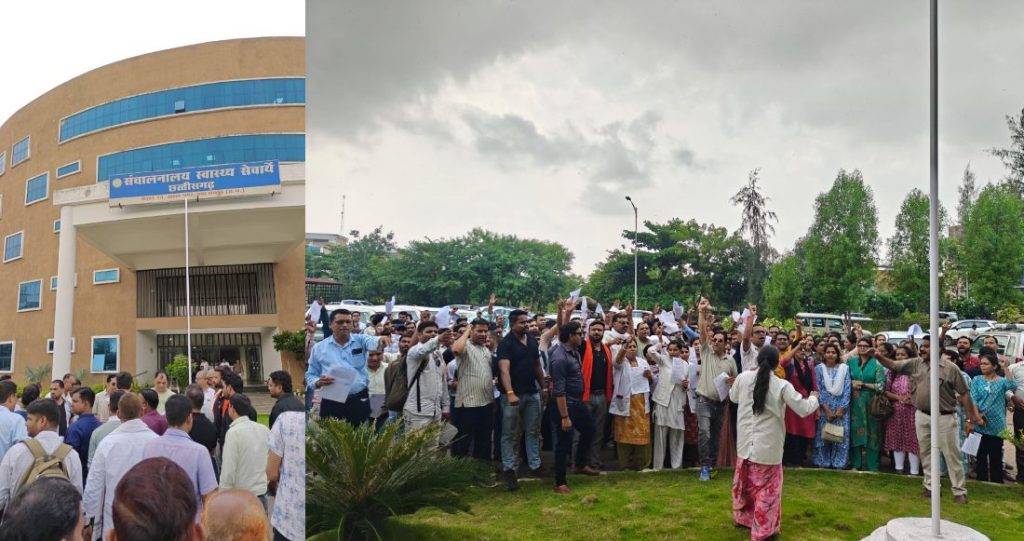 सत्या राजपूत, रायपुर। छत्तीसगढ़ में राष्ट्रीय स्वास्थ्य मिशन (NHM) के कर्मचारियों की 10 सूत्रीय मांगों को लेकर पिछले 15 दिनों से हड़ताल जारी है। सोमवार को मिशन प्रबंधन ने सख्त रुख अपनाते हुए सभी हड़ताली कर्मचारियों को अंतिम अल्टीमेटम जारी किया। आदेश में कहा गया है कि यदि कर्मचारी 24 घंटे के भीतर काम पर नहीं लौटते हैं तो उनकी सेवा समाप्त कर दी जाएगी। इस चेतावनी के विरोध में आज हड़ताली कर्मचारियों ने संचालनालय स्वास्थ्य सेवायें छत्तीसगढ़ कार्यालय का घेराव कर दिया, जहां सभी स्वास्थ्य विभाग के खिलाफ जमकर नारेबाजी कर रहे हैं।