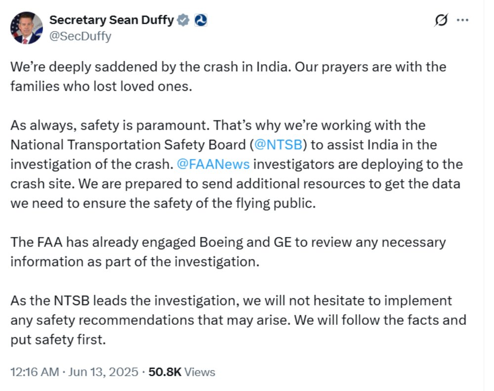 इधर हादसे की जांच में सहयोग करने के लिए अमेरिका ने पेशकश की है। अमेरिकी परिवहन सचिव सीन डफी ने ट्वीट किया, भारत में हुई दुर्घटना से हम बहुत दुखी हैं। हम दुर्घटना की जांच में भारत की सहायता के लिए राष्ट्रीय परिवहन सुरक्षा बोर्ड के साथ काम कर रहे हैं। संघीय उड्डयन प्रशासन के जांचकर्ता दुर्घटना स्थल पर तैनात हैं। हम उड़ान भरने वाले लोगों की सुरक्षा सुनिश्चित करने के लिए आवश्यक डेटा प्राप्त करने के लिए अतिरिक्त संसाधन भेजने के लिए तैयार हैं। एफएए ने जांच के हिस्से के रूप में किसी भी आवश्यक जानकारी की समीक्षा करने के लिए बोइंग और जीई को पहले ही शामिल कर लिया है। चूंकि एनटीएसबी जांच का नेतृत्व कर रहा है, इसलिए हम किसी भी सुरक्षा अनुशंसा को लागू करने में संकोच नहीं करेंगे। हम तथ्यों का पालन करेंगे और सुरक्षा को सबसे पहले रखेंगे।