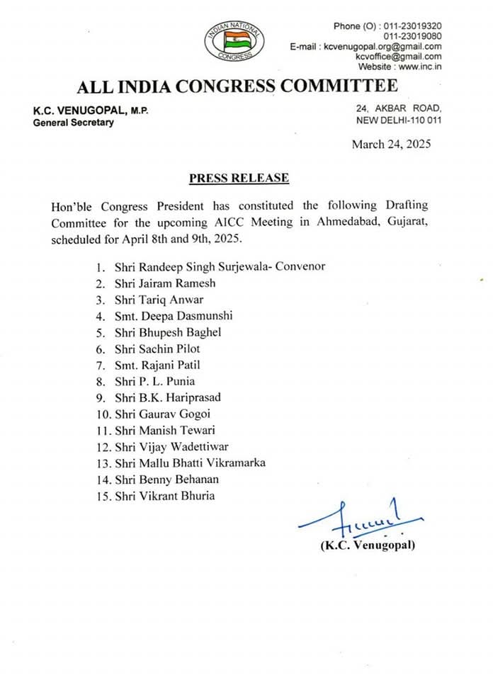 AICC महासचिव के सी वेणुगोपाल ने कल देर रात आदेश जारी किया है। 15 सदस्यीय ड्राफ्टिंग कमेटी में छत्तीसगढ़ के पूर्व सीएम भूपेश बघेल, जयराम रमेश, पी एल पुनिया, सचिन पायलट जैसे कद्दावर नेता हैं। उन सबके बीच विक्रांत भूरिया का भी नाम शामिल है। रणदीप सुरजेवाला इस कमेटी के संयोजक हैं।