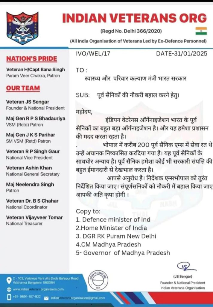 पूर्व सैनिकों ने पत्र के माध्यम से कहा कि इंडियन वेटरेनस ऑर्गेनाइजेशन भारत के पूर्व सैनिकों का बहुत बड़ा ऑर्गनाइजेशन है। यह हमेशा प्रशासन की मदद करता रहता है। भोपाल में करीब 200 पूर्व सैनिक एम्स में सेवारत थे, उन्हें अचानक नौकरी से हत्या दिया गया है। यह पूर्व सैनिकों के साथ घोर अन्याय है। पूर्व सैनिक हमेशा कोई भी सरकारी संपत्ति की बहुत ईमानदारी से देखभाल करता है। उन्होंने केंद्रीय मंत्री से अनुरोध करते हुए कहा कि निदेशक एम्स भोपाल को तुरंत निर्देशित कर उनकी बहाली की जाए।