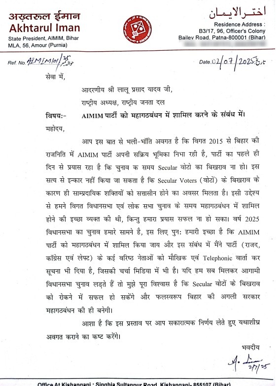 कुंदन कुमार/ पटना। बिहार की सियासत में एक बार फिर हलचल देखने को मिल रही है। ऑल इंडिया मजलिस-ए-इत्तेहादुल मुस्लिमीन (AIMIM) के प्रदेश अध्यक्ष अख्तरूल इमाम ने राजद सुप्रीमो लालू प्रसाद यादव को पत्र लिखकर महागठबंधन में शामिल करने की अपील की है। उन्होंने इस पत्र में बिहार में बढ़ती साम्प्रदायिक ताकतों को रोकने के लिए धर्मनिरपेक्ष दलों की एकता को समय की मांग बताया है।
