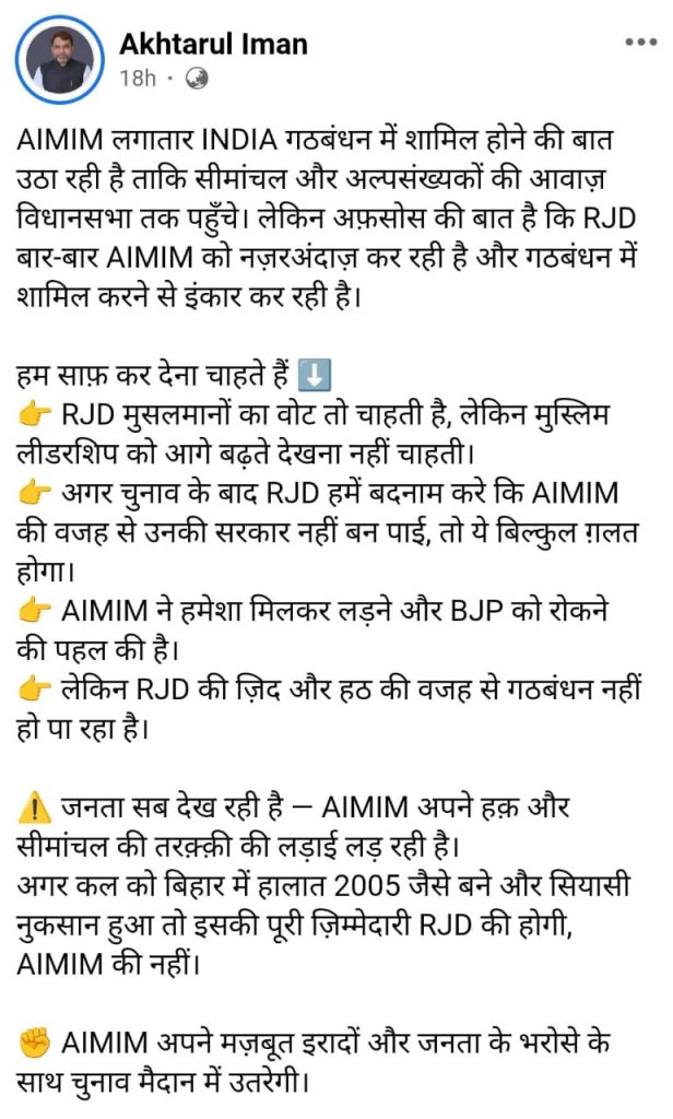 गुरुवार रात को अपने सोशल मीडिया पोस्ट में अख्तरुल ईमान ने RJD पर गंभीर आरोप लगाए। उन्होंने लिखा कि RJD मुस्लिमों का वोट तो लेना चाहती है, लेकिन मुस्लिम नेतृत्व को आगे नहीं आने देना चाहती। उन्होंने यह भी कहा कि AIMIM सीमांचल और अल्पसंख्यकों की आवाज को विधानसभा तक पहुंचाने के लिए लड़ रही है।