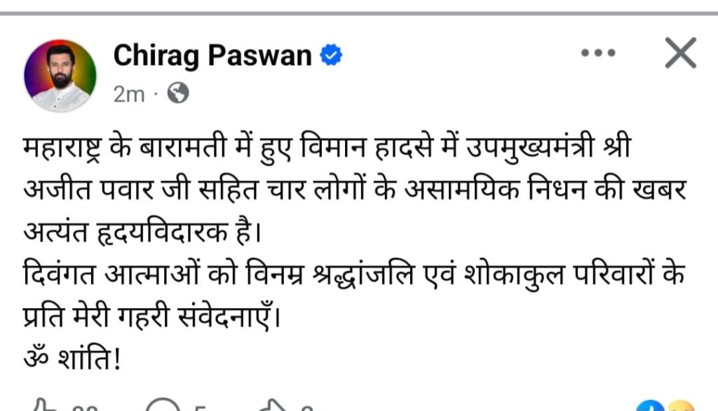 वही दुर्घटना पर चिराग पासवान ने शोक जताते हुए कहा,