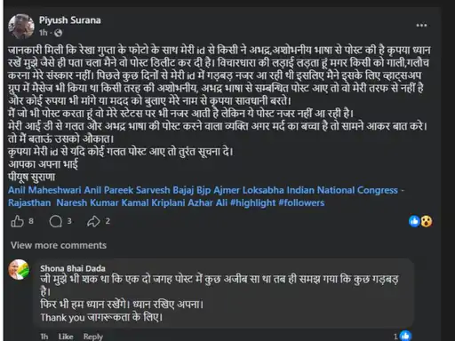 आरोप है कि अजमेर में कांग्रेस के आईटी सेल प्रभारी ने दिल्ली की मुख्यमंत्री रेखा गुप्ता के खिलाफ सोशल मीडिया पर अश्लील टिप्पणी पोस्ट की। जब विवाद बढ़ने लगा तो उन्होंने आगे बढ़ते हुए पोस्ट डिलीट करके कहा- उनकी आईडी हैक हो गई थी साथ ही उन्होंने माफी भी मांगी। वहीं भाजपा के जिला मीडिया संयोजक विक्रमसिंह की ओर से सिविल लाइंस थाने में शिकायत दी गई।