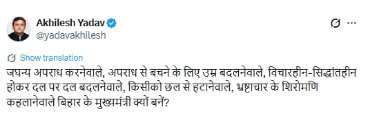 अखिलेश यादव का यह हमला न केवल बिहार की एनडीए सरकार पर सीधा प्रहार है, बल्कि यह आगामी लोकसभा चुनावों से पहले विपक्षी गठबंधन की आक्रामक रणनीति को भी दर्शाता है। इस ट्वीट ने बिहार से लेकर यूपी तक की राजनीति में एक नई बहस छेड़ दी है।