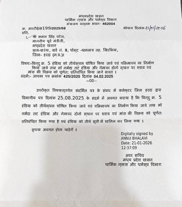 दरअसल, नेमावर और हंडिया स्थित मां नर्मदा तट पर शराब और मांस के विक्रय पर पूर्णतः प्रतिबंध लगाया गया है। 21 जनवरी 2026 को धर्मस्व विभाग की ओर से जारी पत्र इन दिनों सोशल मीडिया पर तेजी से वायरल हो रहा है। सरकार ने तीर्थ नगरी की मर्यादा और धार्मिक वातावरण बनाए रखने के उद्देश्य से यह सख्त निर्णय लिया है।