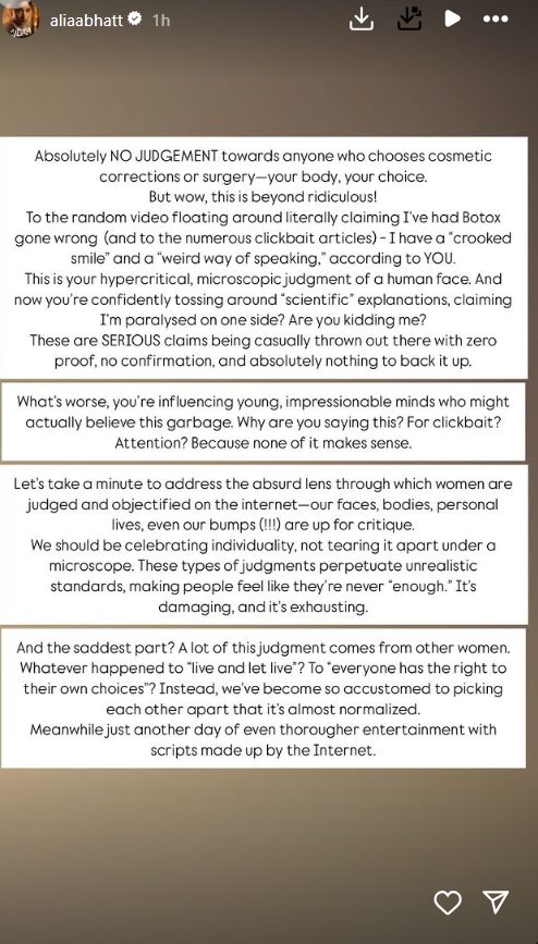 बता दें कि आलिया भट्ट (Alia Bhatt) ने अपने इंस्टाग्राम स्टोरी पर एक पोस्ट शेयर किया है, जिसमें उन्होंने बोटोक्स सर्जरी वाली खबरों पर लोगों को लताड़ लगाई है. एक्ट्रेस ने कहा कि ‘कॉस्मेटिक करेक्शन या सर्जरी का विकल्प चुनने वाले किसी भी व्यक्ति के प्रति कोई जजमेंट नहीं- आपका शरीर, आपकी पसंद. लेकिन वाह, यह तो हास्यास्पद से भी परे है! इंटरनेट पर घूम रहे वीडियो और कई ‘क्लिकबेट लेखों’ पर रिएक्ट करते हुए, जिसमें दावा किया गया था कि उनका बोटॉक्स गलत हो गया था. आपके अनुसार मेरी मुस्कान टेढ़ी है और बोलने का तरीका अजीब है.’ Read More – Bhool Bhulaiyaa 3 का नया पोस्टर आया सामने, दीवाली पर खुलेगा तंत्र और मंत्र के साथ बंधा दरवाजा …