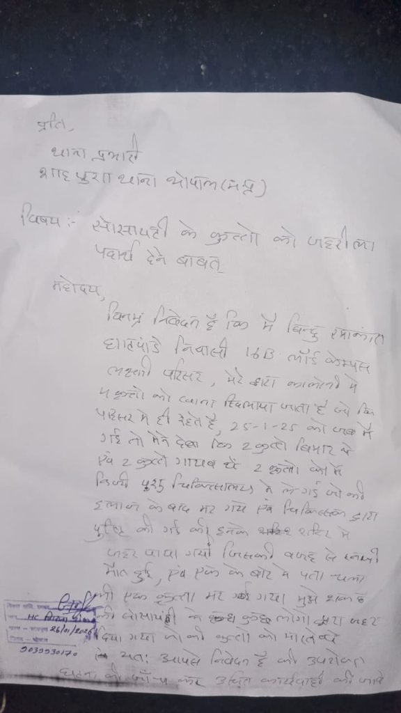 शब्बीर अहमद, भोपाल। मध्यप्रदेश की राजधानी भोपाल में आवार कुत्तों को जहर देकर मारने का हैरान करने वाला मामला सामने आया है। मामले में डॉग लवर ने पुलिस थाने में लिखित शिकायत की है।