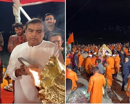 अंबानी परिवार ने हर बार की तरह इस बार भी गणेश चतुर्थी पर ‘एंटीलिया चा राजा’ का स्वागत करने के बाद पंचमी के दिन बप्पा को धूमधाम से विदाई भी दिया है. अनंत-राधिका ने परिवार के साथ मिलकर बप्पा का विसर्जन बेहद धूमधाम से किया है. सामने आए वीडियोज में दोनों को रंग-गुलाल में डूबे और मस्ती करते देखा गया है. बप्पा के विसर्जन के समय के कई वीडियो सोशल मीडिया पर वायरल हो रहे हैं.