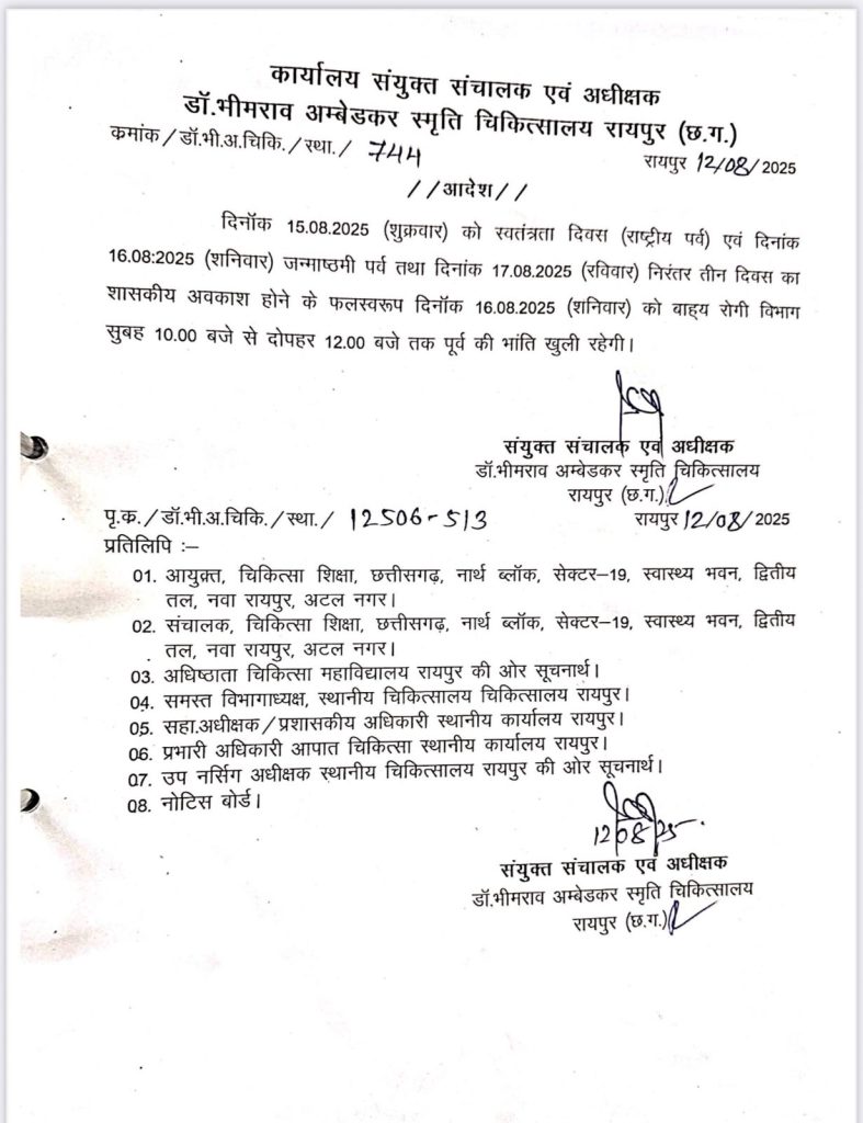 रायपुर। राजधानी के सबसे बड़े सरकारी अस्पताल डॉ. भीमराव अंबेडकर अस्पताल में आगामी तीन दिनों के सरकारी अवकाश के दौरान 1 दिन के लिए मरीजों के लिए स्वास्थ्य सेवाएं जारी रहेंगी. अस्पताल प्रबंधन ने तय किया है कि 16 अगस्त (शनिवार) को सुबह 10 बजे से दोपहर 12 बजे तक OPD खुली रहेगी. हालांकि तीनों दिन आपातकालीन सेवाएं (Emergency) हमेशा की तरह ही 24 घंटे चालू रहेंगी.
