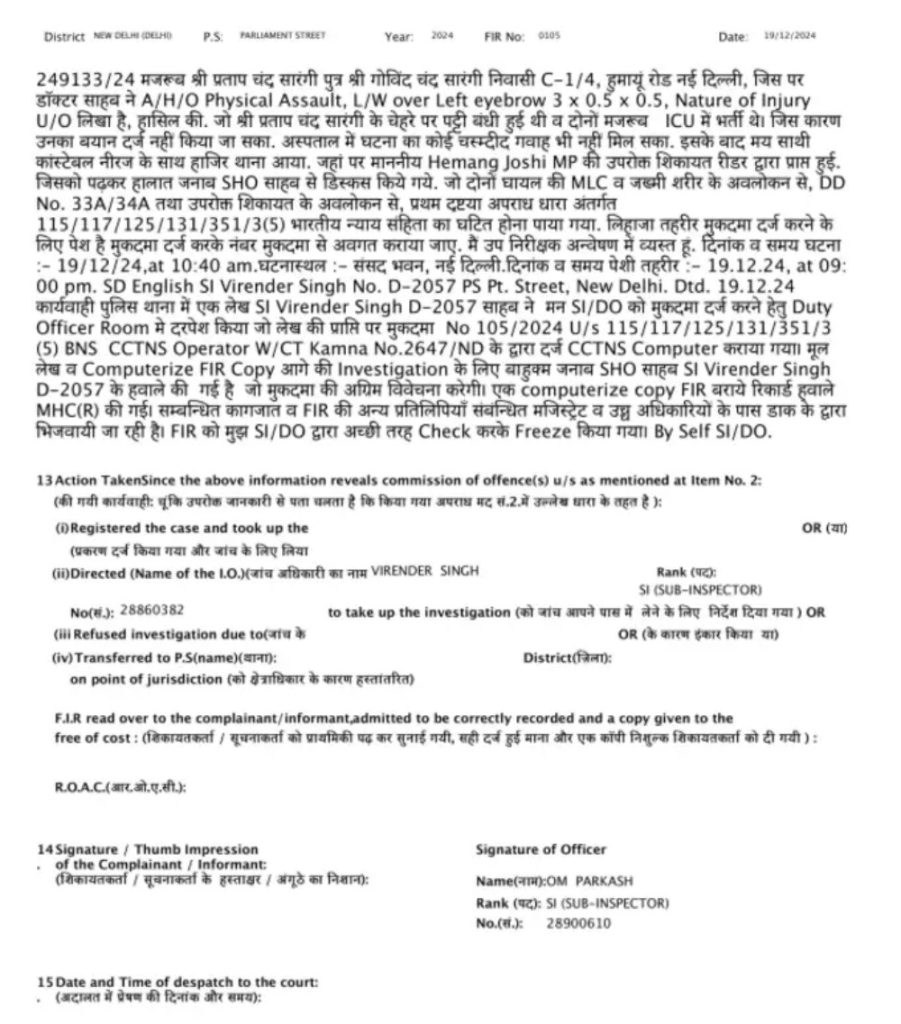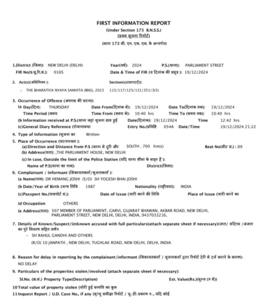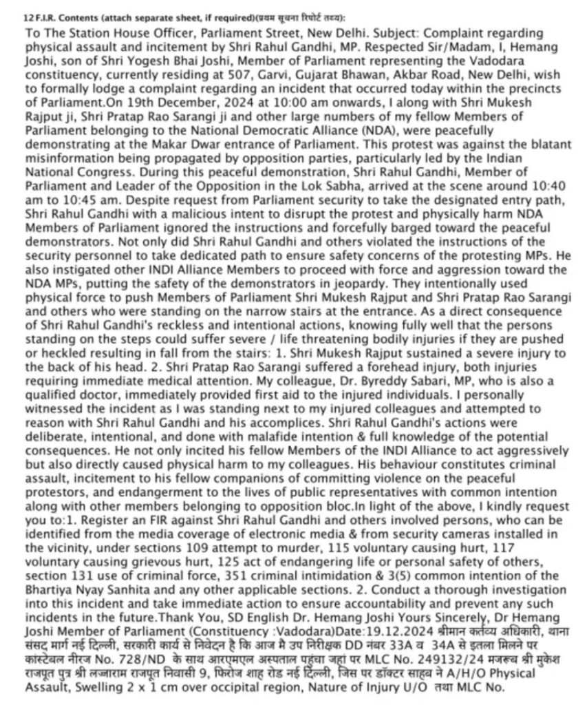 भाजपा ने राहुल गांधी पर धक्का देने का आरोप लगाते हुए सांसद अनुराग ठाकुर और बांसुरी स्वराज ने संसद मार्ग थाने में शिकायत दर्ज कराई थी। दिल्ली पुलिस ने शिकायत के आधार पर राहुल गांधी के खिलाफ FIR दर्ज किया था। दिल्ली पुलिस राहुल गांधी के खिलाफ हत्या के प्रयास BNS की धारा 109 के तहत मुकदमा नहीं दर्ज करेगी। राहुल गांधी के खिलाफ BNS के सेक्शन 117,125, 131,3(5) के तहत FIR दर्ज हो रही है। धारा 117 में स्वेच्छा से गंभीर चोट पहुंचाना, धारा 125 में दूसरों के जीवन या व्यक्तिगत सुरक्षा को खतरे में डालने का कार्य और धारा 131 में आपराधिक बल का प्रयोग करने के आरोप शामिल हैं।