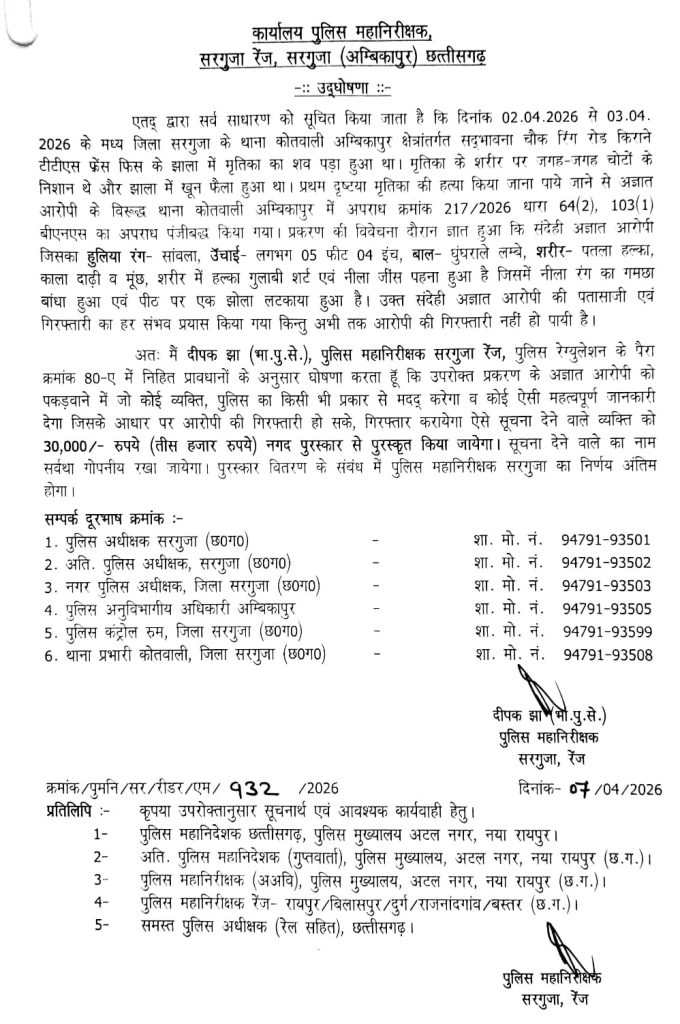 रेंज आईजी दीपक झा (भा.पु.से.) ने पुलिस रेगुलेशन के पैरा क्रमांक 80-ए में निहित प्रावधानों के अनुसार घोषणा की है कि उपरोक्त प्रकरण के अज्ञात आरोपी को पकड़वाने में जो कोई व्यक्ति पुलिस की किसी भी प्रकार से मदद करेगा व कोई ऐसी महत्वपूर्ण जानकारी देगा, जिसके आधार पर आरोपी की गिरफ्तारी हो सके या उसे गिरफ्तार कराया जा सके, ऐसे सूचना देने वाले व्यक्ति को 30,000/- रुपये (तीस हजार रुपये) नगद पुरस्कार से पुरस्कृत किया जाएगा। सूचना देने वाले का नाम सर्वथा गोपनीय रखा जाएगा। पुरस्कार वितरण के संबंध में पुलिस महानिरीक्षक सरगुजा का निर्णय अंतिम होगा।