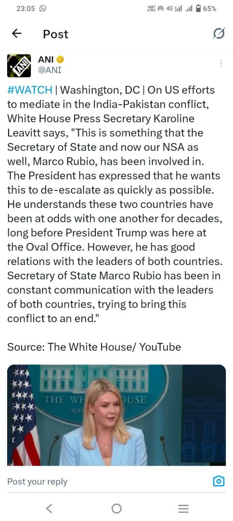 व्हाइट हाउस की प्रेस सचिव कैरोलिन लेविट ने कहा कि ‘मामले में विदेश मंत्री और अब हमारे एनएसए मार्को रुबियो भी शामिल हैं। राष्ट्रपति ने कहा है कि वह चाहते हैं कि यह तनाव जल्द से जल्द कम हो जाए। वह समझते हैं कि ये दोनों देश दशकों से एक-दूसरे के साथ मतभेद रखते हैं। हालांकि उनके दोनों देशों के नेताओं के साथ अच्छे संबंध हैं। विदेश मंत्री मार्को रुबियो दोनों देशों के नेताओं के साथ लगातार संपर्क में हैं और इस संघर्ष को खत्म करने की कोशिश कर रहे हैं।’