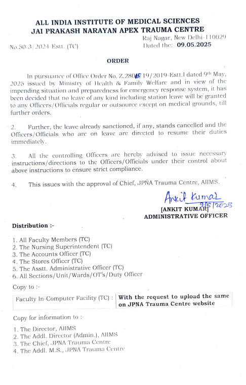 नई दिल्ली। भारत और पाकिस्तान के बीच बढ़ते तनावपूर्ण हालात को देखते हुए अखिल भारतीय आयुर्विज्ञान संस्थान (AIIMS) दिल्ली में कार्यरत सभी अधिकारियों की छुट्टियां रद्द कर दी गई है. यह फैसला केंद्रीय स्वास्थ्य एवं परिवार कल्याण मंत्रालय के निर्देश पर लिया गया है.