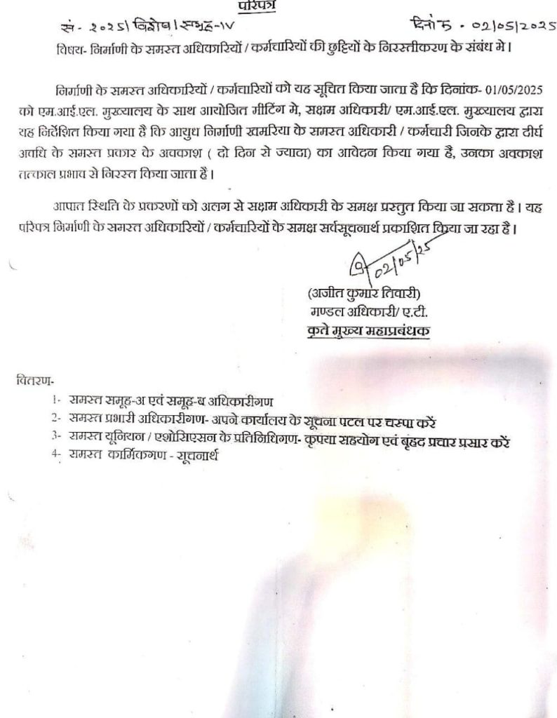 आदेश में कहा गया है कि सीमा को सुरक्षा को मजबूत करने और असलहा का स्टॉक और ज्यादा बढ़ाने के लिए आयुध निर्माण के कर्मचारियों और अधिकारियों की छुट्टी तत्काल प्रभाव से न केवल निरस्त की जाती है बल्कि छुट्टी पर गए तमाम कर्मचारियों को तत्काल प्रभाव से काम पर वापस लौट के निर्देश भी दिए गए हैं। फैक्ट्री प्रशासन से चर्चा करने पर कर्मचारियों को उत्पादन की अधिकता का बढ़ाने का हवाला दिया गया है, लेटर में कहा गया है कि, निर्धारित लक्ष्य की पूर्ति करने के लिए छुट्टियां रद्द की जा रही है।