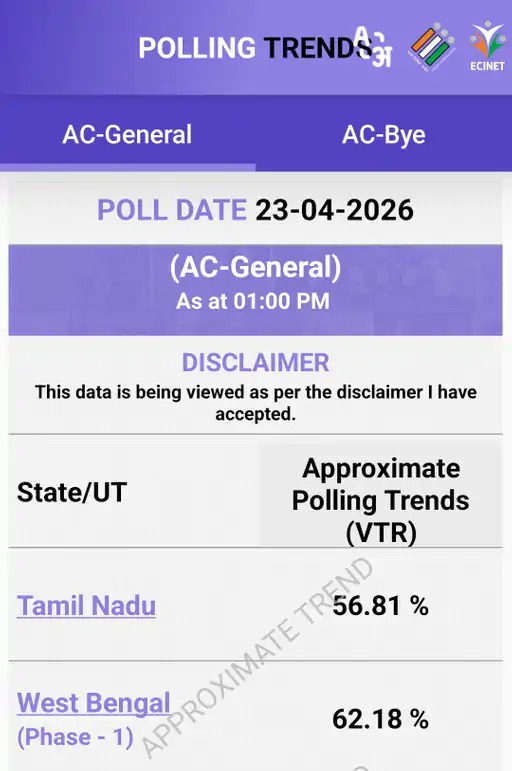 पश्चिम बंगाल (पहले चरण) और तमिलनाडु में वोटिंग की प्रक्रिया जारी है। चुनाव आयोग द्वारा जारी किए गए डेटा के अनुसार, दोपहर एक बजे तक तमिलनाडु में 56.81% और पश्चिम बंगाल में 62.18% वोट डाले जा चुके हैं। पश्चिम बंगाल में फर्स्ट फेज की 152 सीटों पर और तमिलनाडु में सभी 234 सीटों पर वोट डाले जा रहे हैं। तमिलनाडु में जहां शांति व्यवस्था पूरी तरह से कायम है तो वहीं पश्चिम बंगाल के कुछ इलाकों से हिंसा की खबरें सामने आई हैं। पश्चिम बंगाल के मुर्शिदाबाद में हुमायूं कबीर समर्थकों और टीएमसी के कार्यकर्ताओं में जमकर पत्थरबाजी हुई है।