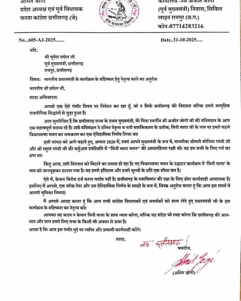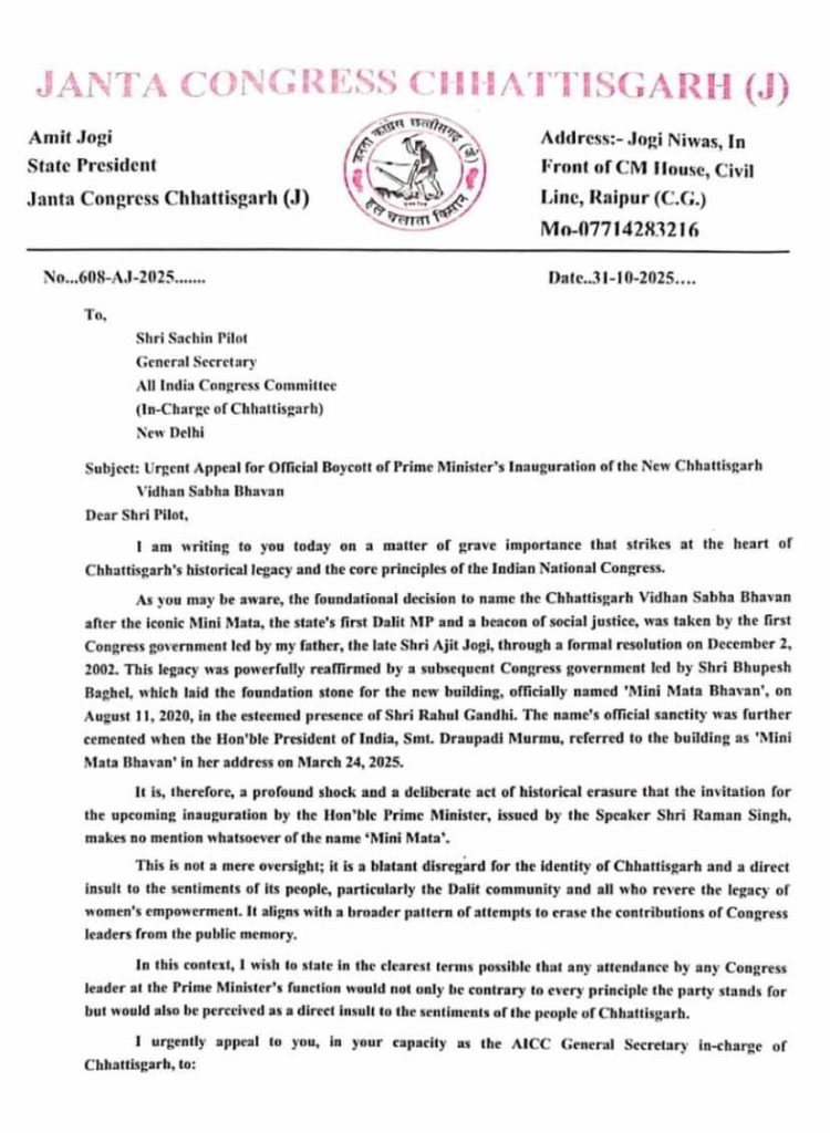 जोगी ने कांग्रेस अध्यक्ष मल्लिकार्जुन खड़गे, लोकसभा में विपक्ष के नेता राहुल गांधी, एआईसीसी प्रभारी सचिन पायलट और पूर्व सीएम भूपेश बघेल को भेजे पत्र में कहा है कि यह मुद्दा सिर्फ एक भवन के नाम का नहीं, बल्कि छत्तीसगढ़ की अस्मिता, दलित सम्मान और कांग्रेस की ऐतिहासिक विरासत से जुड़ा हुआ है।