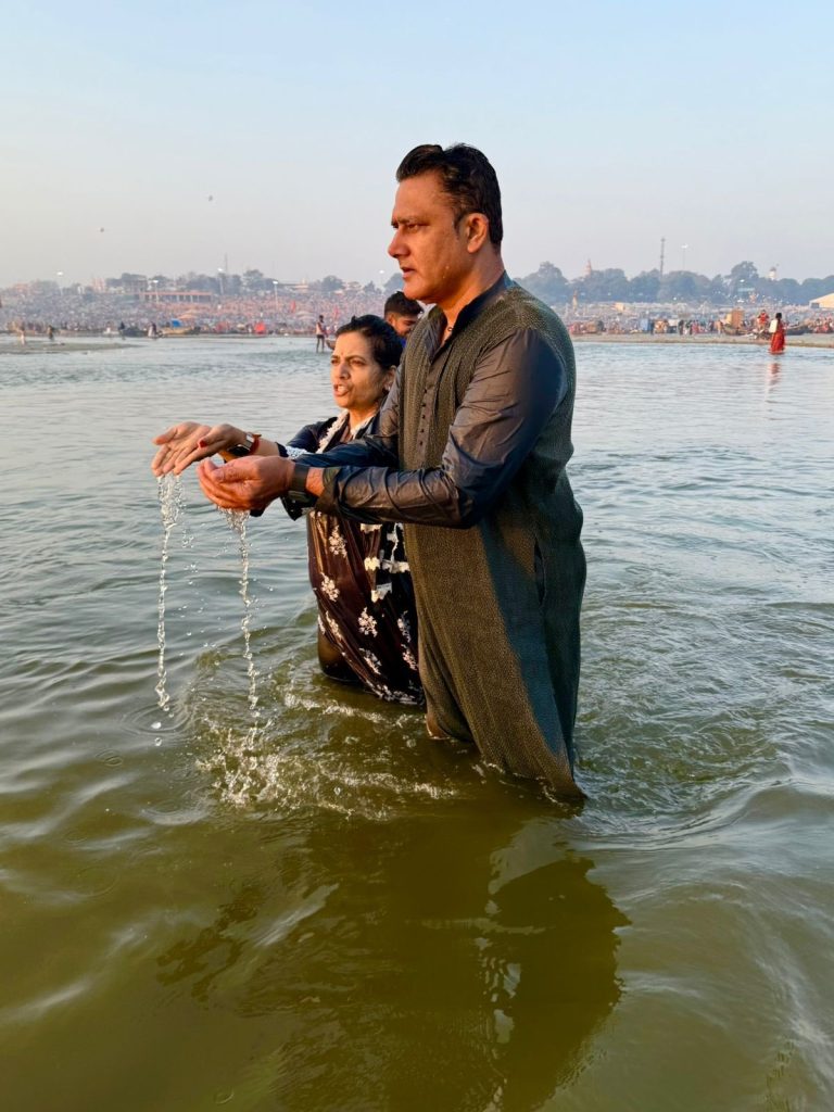 संगम में स्नान करने के बाद अनिल कुंबले ने दर्शन-पूजन किया। इस दौरान उन्होंने कहा कि यहां आकर अच्छा लग रहा है। प्रयागराज हमेशा से ही हमारी धार्मिक और सांस्कृतिक नगरी रही है। महाकुंभ जैसे आयोजन के जरिए भारत के धार्मिक और सांस्कृतिक परंपरा को करीब से जानने का मौका मिलता हैं। माघी पूर्णिमा के दिन संगम में स्नान करने का सौभाग्य प्राप्त हुआ। पूर्व क्रिकेटर ने अपने एक्स हैंडल पर महाकुंभ से जुड़ी तस्वीर भी शेयर की है। जिसमें वो अपनी के साथ बोटिंग का आनंद लेते हुए नजर आ रहे है। साथ ही संगम में गंगा स्नान भी कर रहे हैं।