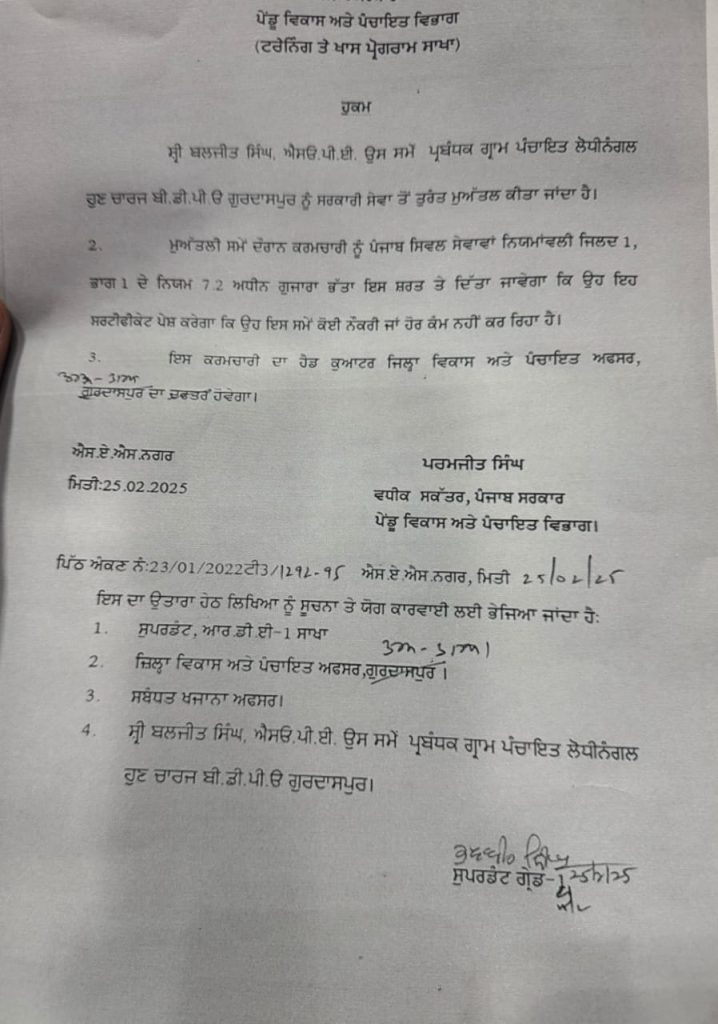 मिली जानकारी के अनुसार, गुरदासपुर के बी.डी.पी.ओ. द्वारा गांव पंचायत लोधीनंगल में प्रबंधक नाते लगभग 9 लाख रुपए के गबन सहित अन्य अनियमताओं संबंधी विधायक गुरदासपुर बरिन्द्र सिंह पाहड़ा द्वारा विधानसभा में मामला उठाने पर पंजाब सरकार ने आज उसे सस्पेंड कर दिया।