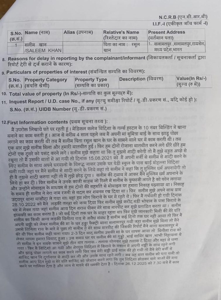 संदीप शर्मा, विदिशा। मध्यप्रदेश के विदिशा जिले में एक बार फिर लव जिहाद और धर्म परिवर्तन का मामला सामने आया है। सलीम खान नामक युवक ने पहले हिंदू युवती से शादी की, फिर जबरन इस्लाम कबूल करवाया। एक बच्चे की मां बनने के बाद आरोपी सलीम खान ने एक अन्य युवती से दूसरी शादी कर ली।