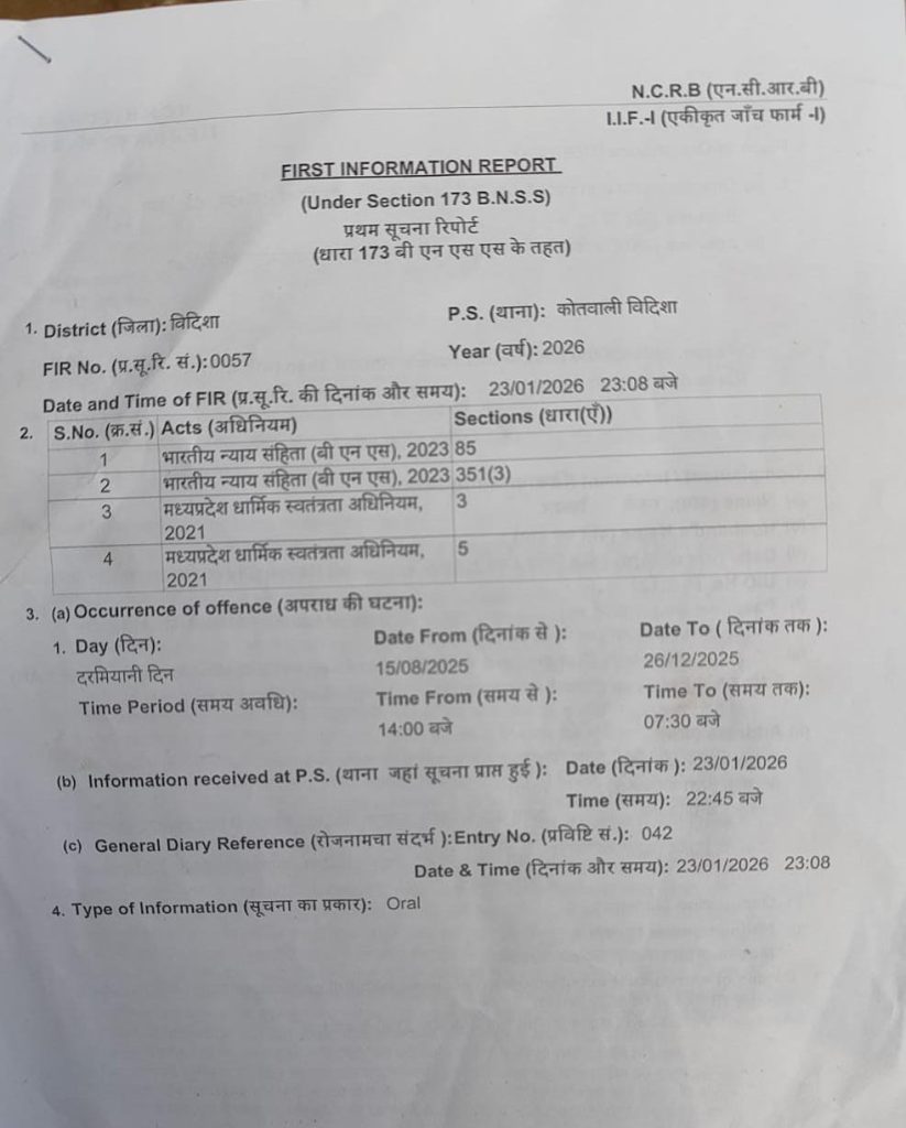 दरअसल मामला विदिशा जिले के कोतवाली थाना क्षेत्र का है। युवती ने शिकायत में बताया कि पहले युवक पर पहचान छुपाकर दोस्ती करने, भावनात्मक रूप से करीब आने और बाद में धोखाधड़ी करने सहित धर्म परिवर्तन करने के बाद तीन तलाक का आरोप लगाया है। मामले की जानकारी मिलते ही पुलिस ने शिकायत के आधार पर कानूनी धाराओं में प्रकरण दर्ज कर जांच शुरू कर दी है।