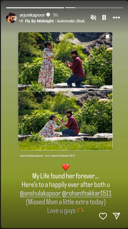 बता दें कि अंशुला कपूर (Anshula Kapoor) की सगाई की खबर सुनने के बाद अर्जुन कपूर (Arjun Kapoor) काफी भावुक हो गए हैं. एक्टर ने अपने इंस्टाग्राम स्टोरी पर बहन के पोस्ट को रि-पोस्ट करते हुए लिखा- ‘मेरी लाइफ को उसका लाइफ पार्टनर मिल गया. तुम दोनों के लिए हमेशा खुशियों की कामना करता हूं. आज मां की कुछ ज्यादा ही याद आई है. तुम दोनों को ढेर सारा प्यार.’ वहीं, जान्हवी कपूर (Janhvi Kapoor) और खुशी कपूर (Khushi Kapoor) भी अंशुला की शादी के लिए एक्साइटेड हैं.
