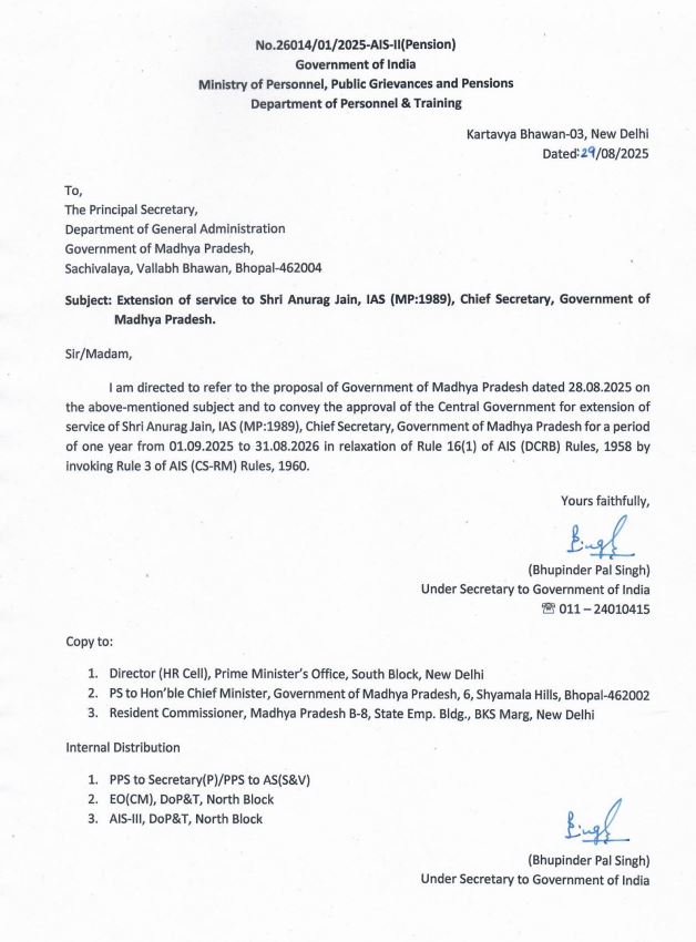भोपाल। मध्य प्रदेश के मुख्य सचिव अनुराग जैन के एक्सटेंशन का आदेश जारी हो गया है। भारत सरकार के कार्मिक, लोक शिकायत एवं पेंशन मंत्रालय ने ऑर्डर जारी किया है। अनुराग जैन अब 2026 तक एमपी के सीएस बने रहेंगे।