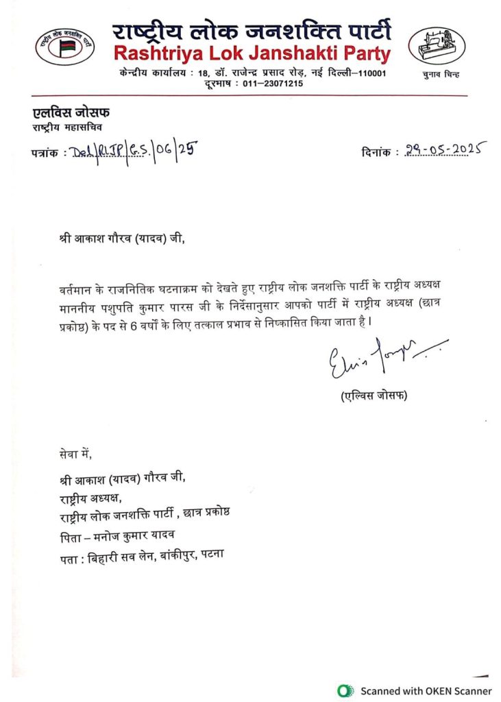 इस संबंध में पशुपति कुमार पारस के आदेश से एक पत्र भी जारी किया गया है, जिसमें साफ साफ लिखा है कि वर्तमान के राजनीतिक घटनाक्रम को देखते हुए ये निर्णय पूर्व केंद्रीय मंत्री पशुपति कुमार पारस ने लिया है. आपको बता दें कि आकाश यादव ने तेज प्रताप मामले को लेकर कई बयान दिए थे और लालू परिवार को इस मामले को आपस में सुलझाने की बात कही थी.