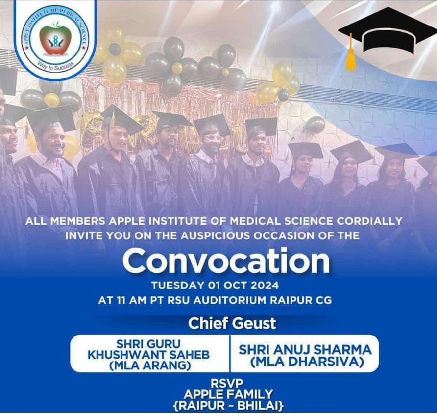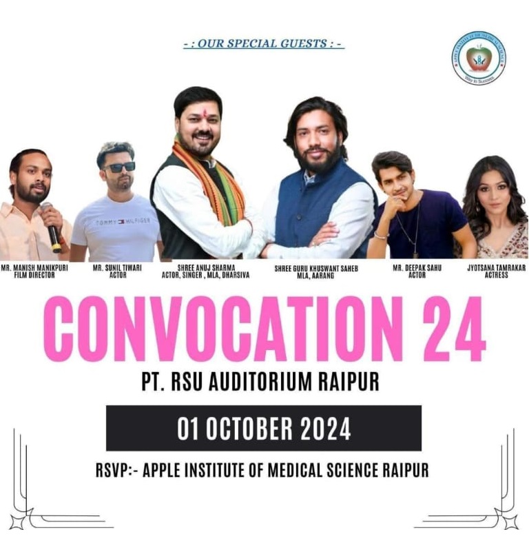 प्रतीक चौहान. रायपुर. राजधानी रायपुर में बिना किसी मान्यता के Apple Institute of Medical Science के नाम से एक कॉलेज संचालित हो रहा है. ये कॉलेज मोवा ब्रिज लोधीपारा के पास 4 मंजिला बिल्डिंग में संचालित हो रहा है. पंडित रविशंकर यूनिवर्सिटी के ऑडिटोरियम में इस बिना मान्यता वाली कॉलेज का कंवोकेशन है, जिसमें मुख्य रूप से बतौर स्पेशल गेस्ट धरसींवा से भाजपा विधायक अनूज शर्मा और आरंग से भाजपा विधायक और धर्म गुरू खुश्वंत साहेब को आमंत्रित किया गया है, इसकी जानकारी कॉलेज द्वारा बनाए गए पोस्टर से मिली है, जिसे कॉलेज के प्रोफेसर समेत अन्य ने सोशल मीडिया में शेयर किया है.