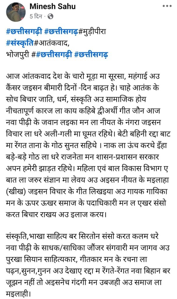 उन्होंने कहा कि भोजपुरी में जिस तरह से अश्लील गानों को बढ़ावा जाता है, वैसे ही कोशिश इन दिनों छत्तीसगढ़ में भी की जा रही है. इसे रोकना हम सभी की जिम्मेदारी है. यही वजह है कि आज हमने थाने के बाहर प्रदर्शन किया और अपना विरोध दर्ज कराया.
