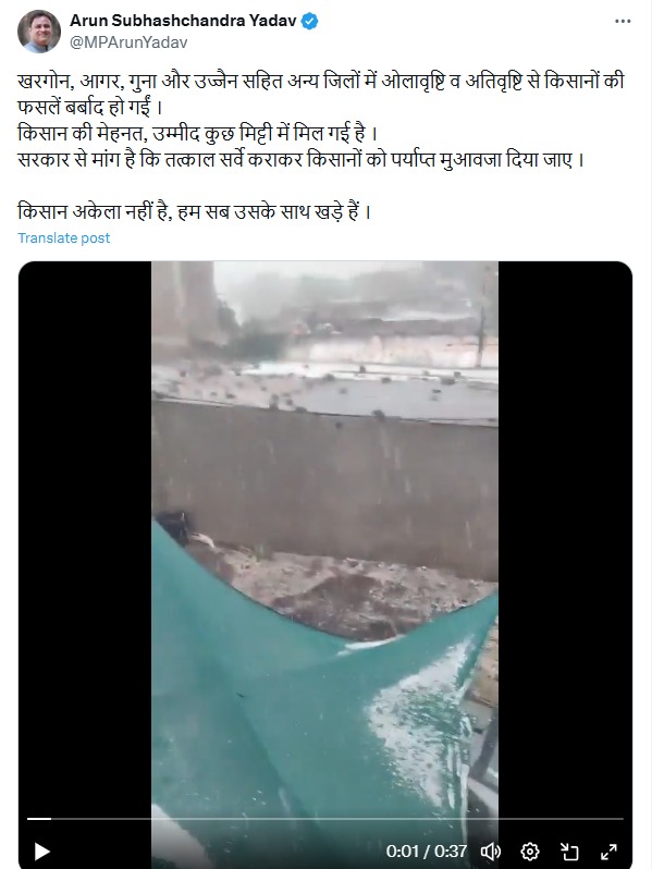 कांग्रेस नेता व पूर्व प्रदेश अध्यक्ष अरुण यादव ने अपने सोशल मीडिया अकाउंट एक्स (X) पर एक वीडियो शेयर किया हैं। जिसमें उन्होंने लिखा- खरगोन, आगर, गुना और उज्जैन सहित अन्य जिलों में ओलावृष्टि व अतिवृष्टि से किसानों की फसलें बर्बाद हो गईं। किसान की मेहनत, उम्मीद कुछ मिट्टी में मिल गई है। सरकार से मांग है कि तत्काल सर्वे कराकर किसानों को पर्याप्त मुआवजा दिया जाए। किसान अकेला नहीं है, हम सब उसके साथ खड़े हैं।