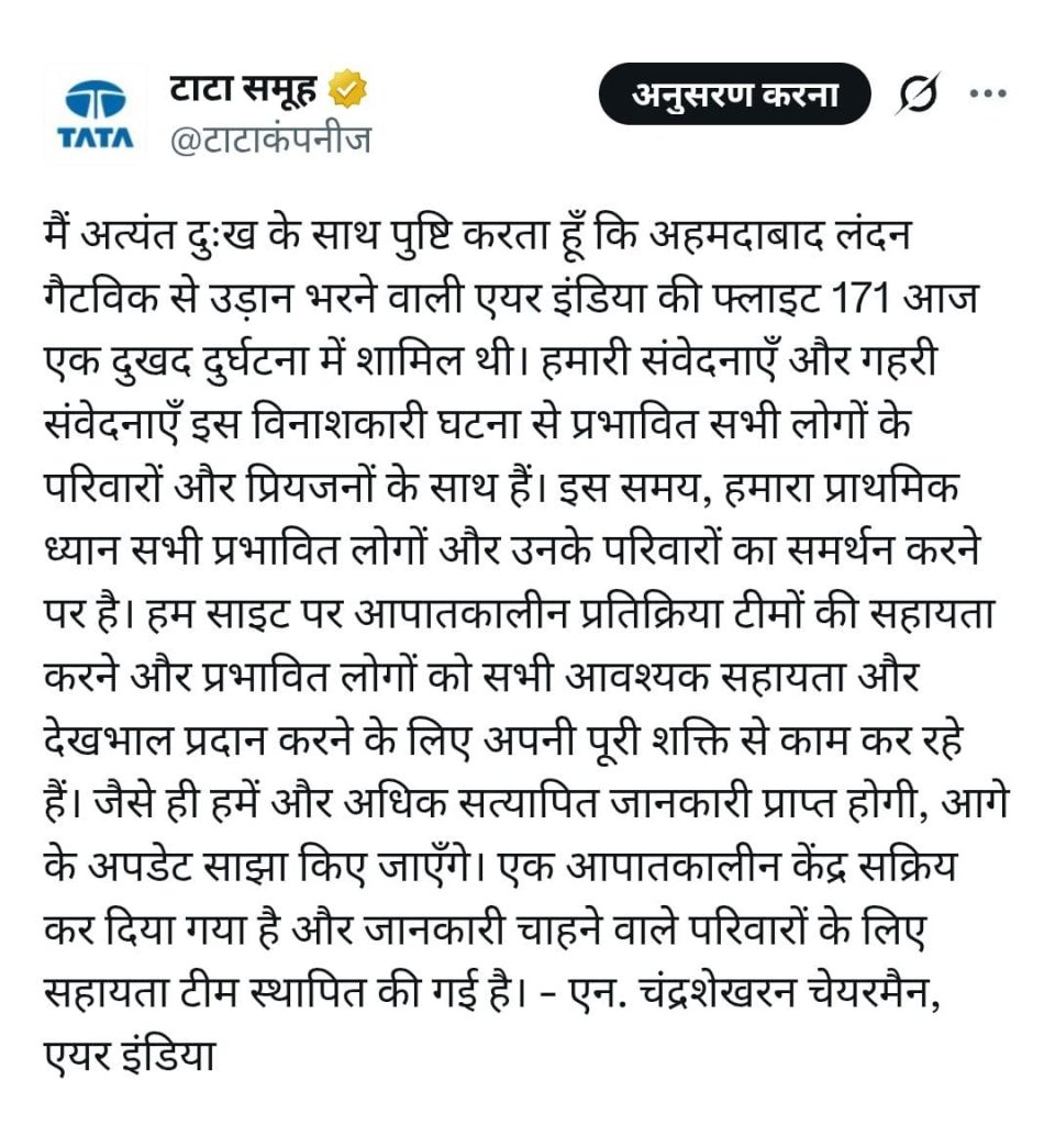 • Air India फ्लाइट AI171 (अहमदाबाद से लंदन) आज दोपहर करीब 13:20 बजे हुआ क्रैश