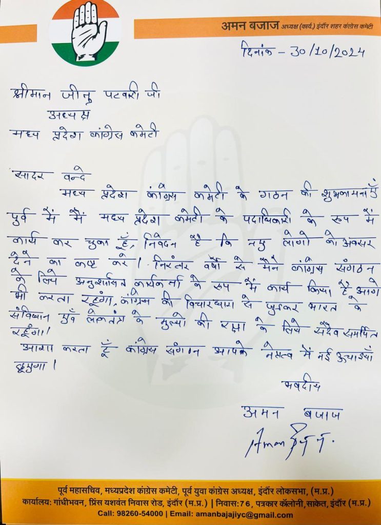 इंदौर शहर के कार्यकारी अध्यक्ष अमन बजाज ने जीतू पटवारी को पत्र लिखकर कहा कि कांग्रेस कमेटी के गठन की शुभकामनाएं। इसके पहले मैं पदाधिकारी के रूप में काम कर चुका हूं। नए लोगों को मौका दिया जाए। बता दें कि बजाज पहले भी प्रदेश महासचिव की भूमिका में रह चुके हैं।