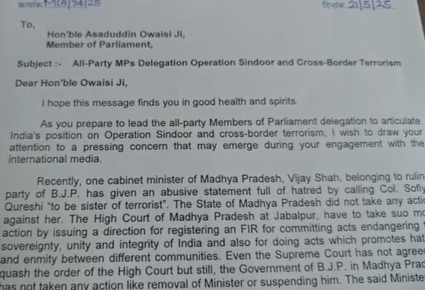 मसूद ने अपने पत्र में लिखा था ‘शशि थरूर और असदुद्दीन ओवैसी जी, जैसा कि आप ऑपरेशन सिंदूर और सीमा पार आतंकवाद पर भारत की स्थिति को स्पष्ट करने के लिए सर्वदलीय सांसदों के प्रतिनिधिमंडल का नेतृत्व करने की तैयारी कर रहे हैं। मैं आपका ध्यान एक गंभीर चिंता की ओर आकर्षित करना चाहता हूं, जो अंतरराष्ट्रीय मीडिया के साथ आपकी बातचीत के दौरान उभर सकती है। हाल ही में, मध्य प्रदेश के एक कैबिनेट मंत्री, विजय शाह, जो सत्तारूढ़ भाजपा पार्टी से संबंधित हैं, ने कर्नल सोफिया कुरैशी को “आतंकवादी की बहन” कहकर घृणा से भरा अपमानजनक बयान दिया है।’