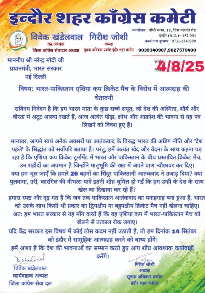 कांग्रेस सेवादल के कार्यकारी अध्यक्ष विवेक खंडेलवाल ने केंद्र सरकार को चेतावनी दी है कि अगर यह मुकाबला रद्द नहीं किया गया तो वे 14 सितंबर को इंदौर में आत्मदाह करेंगे। खंडेलवाल ने कहा कि हाल ही में जम्मू-कश्मीर के पहलगाम में पाकिस्तानी आतंकियों के हमले में 26 निर्दोष नागरिकों की मौत हुई थी, जिनमें कई विवाहित महिलाएं भी थीं।