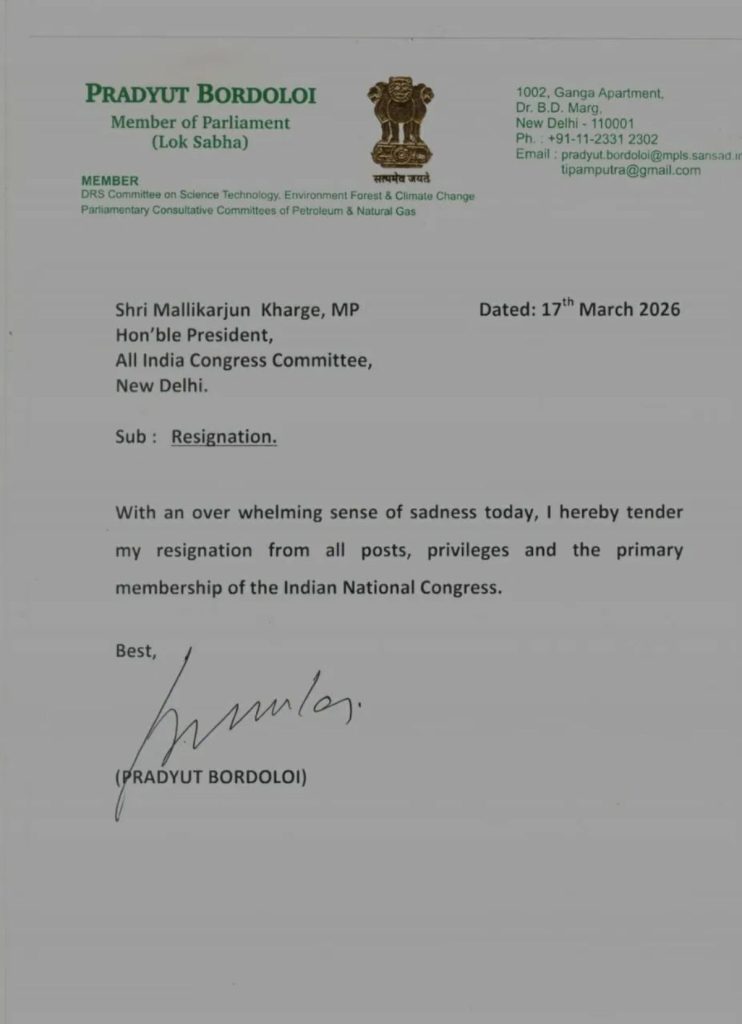 लोकसभा सांसद प्रद्युत बोरदोलोई ने मंगलवार को AICC अध्यक्ष मल्लिकार्जुन खड़गे को अपना इस्तीफा भेज दिया। बोरदोलोई ने अपने एक लाइन के इस्तीफे में लिखा-बेहद दुख के साथ मैं आज भारतीय राष्ट्रीय कांग्रेस की प्राथमिक सदस्यता और सभी पदों से इस्तीफा देता हूं। हालांकि माना जा रहा है कि टिकट बंटवारे से नाराजगी इस इस्तीफे की बड़ी वजह है। नवज्योति तालुकदार ने भी कांग्रेस अध्यक्ष मल्लिकार्जुन खरगे को पत्र लिखा है। उन्होंने पत्र में पार्टी की कार्यप्रणाली से लंबे समय से चली आ रही असंतुष्टि और अपनी बार-बार शिकायतों के बाद भी कोई समाधान नहीं मिलने का हवाला दिया। उन्होंने आगे कहा कि ऐसी परिस्थितियों में पार्टी में बने रहना स्वीकार्य नहीं है।