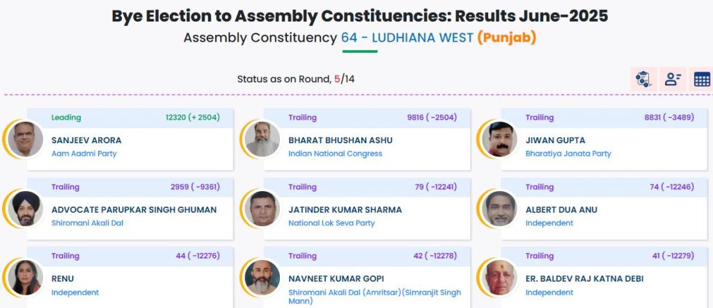 5वें राउंड की मतगणना के बाद AAP प्रत्याशी संजीव अरोड़ा को बढ़त