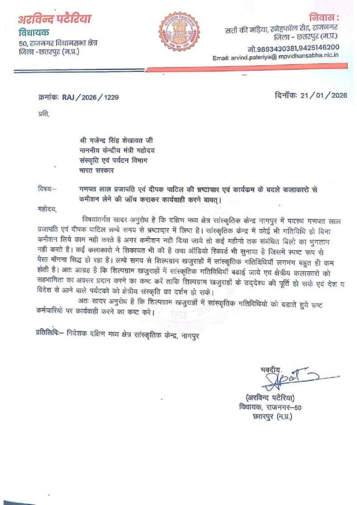 शशांक द्विवेदी, खजुराहो। दक्षिण-मध्य क्षेत्र नागपुर में पदस्थ असिस्टेंट पर भ्रष्टाचार के आरोप लगे हैं। कलाकारों ने शिकायत की है कि गणपत लाल प्रजापति और दीपक पाटिल ने कलाकारों से कार्यक्रम मंचन को लेकर कमीशन मांगी थी। राजनगर विधायक अरविंद पटेरिया ने इसकी शिकायत केंद्रीय मंत्री से कर कार्रवाई की मांग की है।