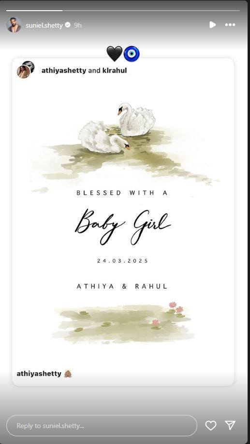 हाल ही में नाना बने सुनील शेट्टी (Suniel Shetty) ने भी अपने सोशल मीडिया पर फैंस के साथ इस खुशखबरी को शेयर किया है. उन्होंने इंस्टाग्राम स्टोरी अथिया- राहुल के पोस्ट को रि-पोस्ट किया है और नजर और ब्लैक हार्ट वाले इमोजी से जोड़ा है.