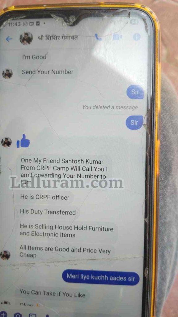 वनरक्षक ने मामले की जानकारी विभागीय वरिष्ठ अधिकारियों को दी है। जिसके बाद उनके निर्देश पर पुलिस में शिकायत दर्ज करवाई गई है। वनरक्षक ने बताया कि तत्कालीन जिला पंचायत सीईओ शिशिर गेमावत की फर्जी फेसबुक आईडी से फ्रेंड रिक्वेस्ट भेजी गई थी। जिसे एक्सेप्ट करने के बाद मैसेज में काफी बातें हुई। फर्जी आईडी से एक नंबर दिया गया जिस पर लग्जरी सोफे और अन्य सामान के नाम पर 95 हजार रुपए ठगी करने की कोशिश की गई।