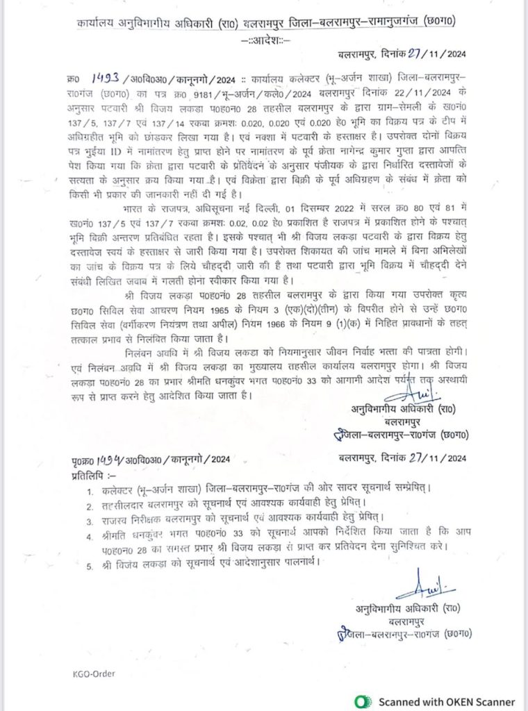 जानकारी के अनुसार, ग्राम सेंमली (बलरामपुर) में खसरा नंबर 137/5, 137/7 और 14 की भूमि की बिक्री से जुड़ा मामला है. शिकायत मिलने के बाद मामले की जांच के लिए उच्च स्तरीय समिति का गठन किया गया था.