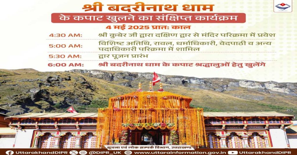 चमोली। Badrinath Dham Opening Date 2025 : भगवान बद्रीनाथ धाम के कपाट 4 मई 2025 को सुबह 6 बजे पूरे विधि विधान के साथ खुलेंगे। कपाट खुलने से पहले धाम को फूलों से सजाया जा रहा है, जो बेहद खूबसूरत नजारा देखते ही बनता है। बड़ी संख्या में श्रद्धालु दर्शन के लिए पहुंच रहे हैं। बदरीनाथ धाम के कपाट खुलने की प्रक्रियाओं के तहत शनिवार को भगवान उद्धव, गरुड़ उत्सव डोलियां और आदि गुरु शंकराचार्य जी गद्दी परम्परा अनुसार बदरीनाथ धाम पहुंच गईं। मंदिर के कपाट कल, 4 मई को सुबह 6 बजे खुलेंगे।