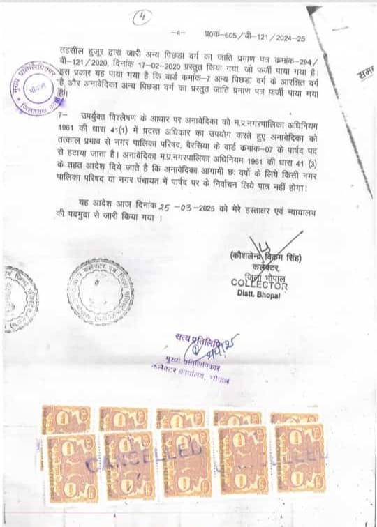 शिखिल ब्यौहार, भोपाल। मध्य प्रदेश की राजधानी भोपाल से एक बड़ी खबर सामने आई है। नगर पालिका के एक पार्षद का फर्जी जाति प्रमाण पत्र पाया गया। जिसके बाद कलेक्टर ने पार्षद को पद से हटाने का आदेश जारी किया है। साथ ही पार्षद पर छह साल तक चुनाव लड़ने पर प्रतिबंध भी लग गया है। वहीं कलेक्टर ने एफआईआर के भी आदेश दिए हैं।