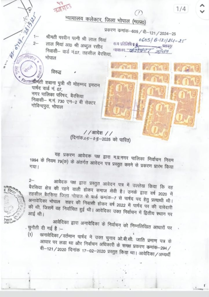 भोपाल के बैरसिया नगर पालिका की पार्षद शबाना कुरैशी का जाति प्रमाण पत्र फर्जी निकला है। वे वार्ड क्रमांक 7 से एनसीपी पार्टी से चुनाव जीता था। फर्जी जाति प्रमाण पत्र पाए जाने के बाद कलेक्टर कौशलेंद्र विक्रम सिंह ने पार्षद शबाना को पद से हटाने का आदेश जारी किया है। साथ ही FIR के भी आदेश दिए है। शबाना कुरैशी अब छह साल तक कोई भी चुनाव नहीं लड़ सकेंगी।