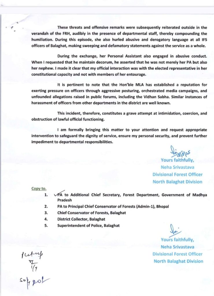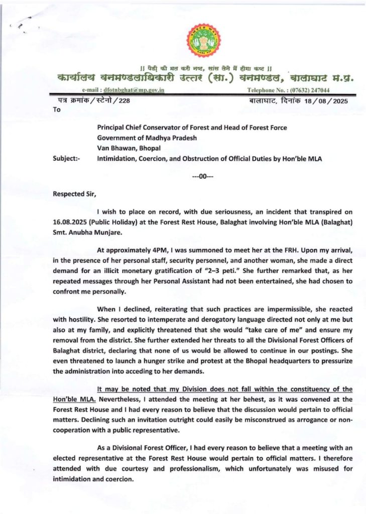 नीरज काकोटिया, बालाघाट। मध्य प्रदेश के बालाघाट से कांग्रेस विधायक अनुभा मुंजारे पर वन विभाग की डीएफओ नेहा श्रीवास्तव से 2 से 3 लाख रुपए की डिमांड और धमकी देने का आरोप लगाया है। इतना ही नहीं, नेहा श्रीवास्तव का कहना है कि जब उन्होंने मानने से साफ इनकार किया, तो विधायक ने न केवल आपत्तिजनक भाषा का प्रयोग किया बल्कि परिवार को टारगेट करने तक की धमकी दी। इस पूरे मामले की शिकायत डीएफओ ने पीसीसीएफ भोपाल को पत्र के माध्यम से की है।