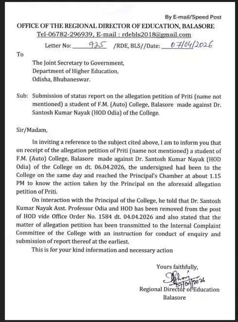 बालासोर: फकीर मोहन ऑटोनॉमस कॉलेज ने एक छात्रा द्वारा उत्पीड़न की लिखित शिकायत दर्ज किए जाने के बाद डॉ. संतोष कुमार नायक को उड़िया विभाग के प्रमुख (HOD) के पद से हटा दिया है।